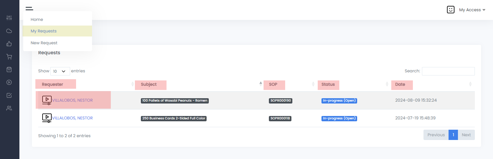 My Requeststo show all your requests that you have raised in the database, here you will see the requester information or email, the subject of the request, SOP ID, status, date and time it was process.