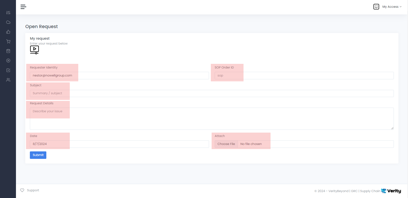 This form is used by an internal application user to initiate some sort of request. Once the user opens a request, its assigned to the default workflow. A new Request to the client starts by completing the requester ID, the SOP order ID is by default, a subject title, details, date and finally a supporting file attachment is required.